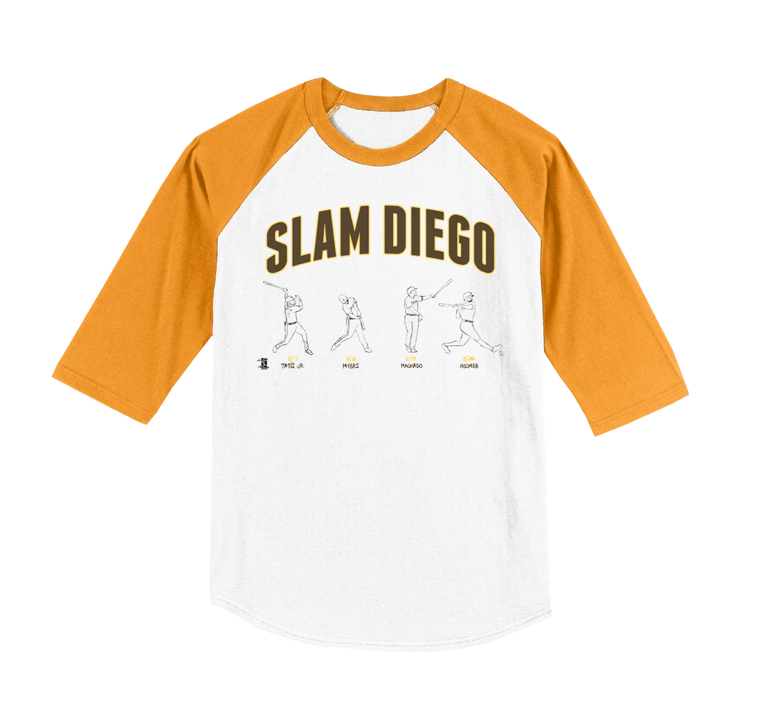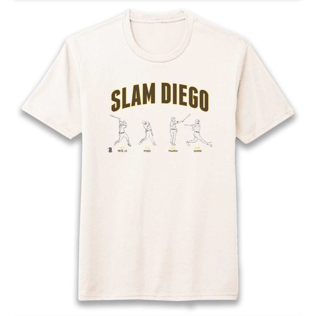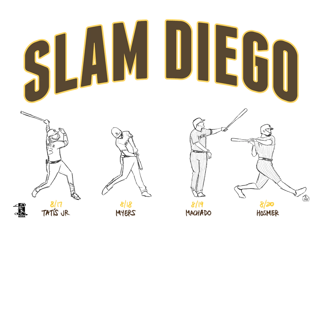 This historic feat of four grand slams in four games by San Diego Padres players Fernando TatÃs, Wil Myers, Manny Machado, and Eric Hosmer has been captured by the legendary baseball artist, @Drawawalk. We’ve partnered with her to release this officially licensed MLBPA design. Be sure to follow her “Acceptably Drawn Baseball” account on Twitter here.